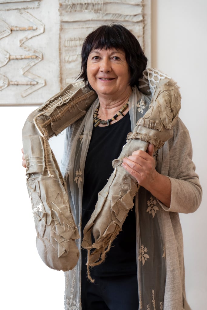 Susanne Guzei-Taschner gestaltet mit ihrer Acrylmalerei und Objektkunst komplexe Bildcollagen. Sie kombiniert verschiedene Stoffe und