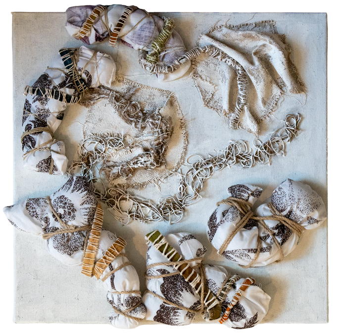 Acryl auf Jute und Leinen, Schnüre, Steine