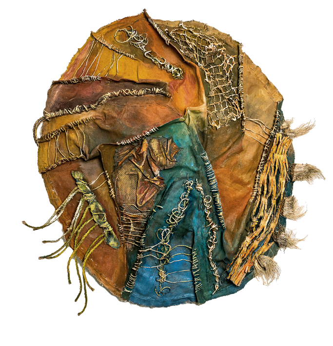 Acryl auf Leinwand, diverse Stoffe und Schnüre